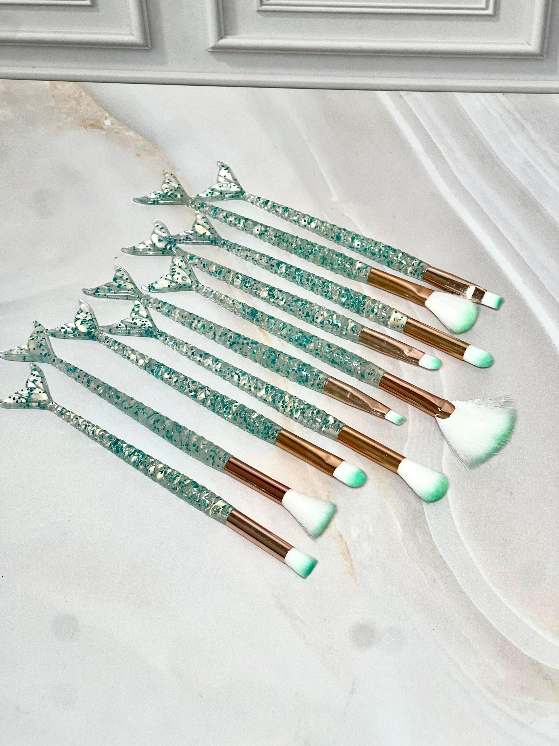 Set de brochas cola de sirena con mango fancy con destellos, estas hermosas brochas vienen en tonos diferentes, pero además de tener un empaque lindo su calidad es perfecta para crear maquillajes impactantes y de buena calidad.